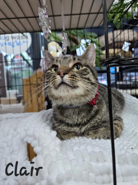 Clair - availableFemale1 YearClair is a charming young lady. This one year old is somewhat cautious when picked up but then settles in quickly with some purrs.