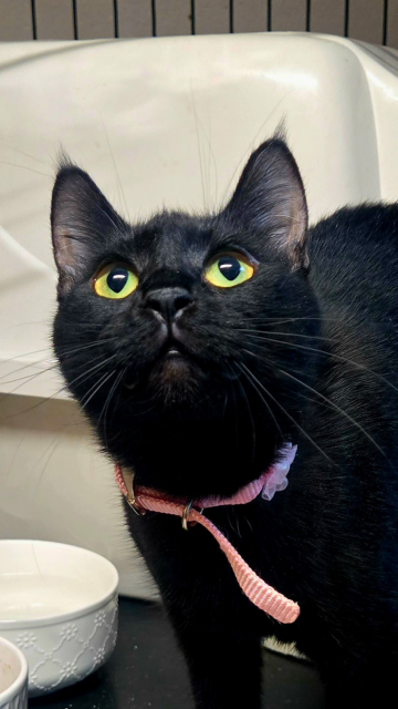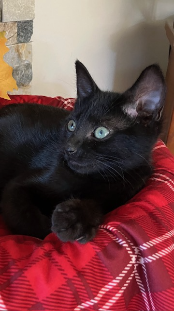 Panther - adoptedFemale3 YearsPanther is a 3 year old black beauty! Born on November 8, 2022. She enjoys relaxing in her cuddly bed and using her scratching post. She is very laid back and takes a while to warm up.