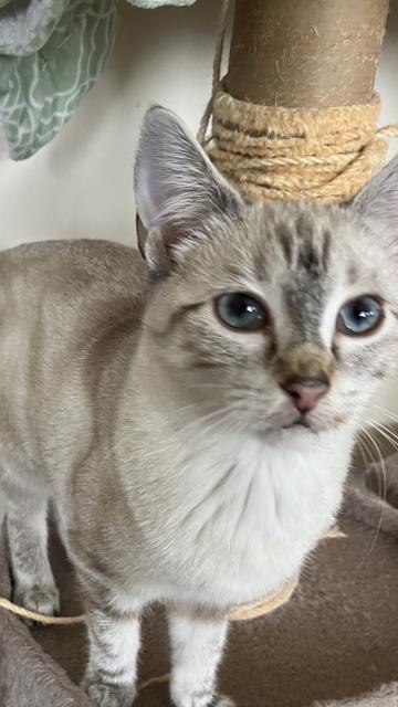 Allegra - AdoptedFemale5 MonthsAllegra has the colours and blue eyes of a Lilac Point Siamese without the attitude. This gorgeous young lady is sweet, gentle and calm. Allegra would love a home with a comfy lap to curl up in.