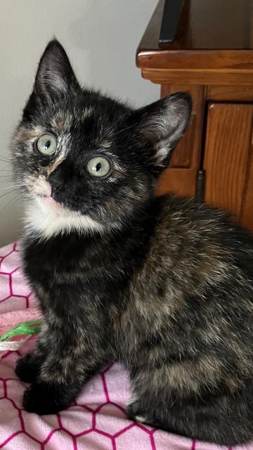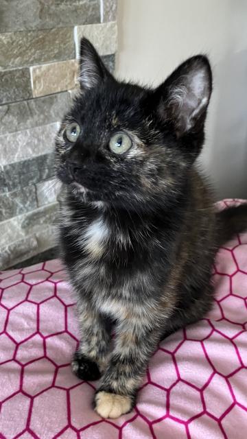 Cookie - AdoptedFemale2 MonthsMy foster mom says that my toes look like butterscotch cookie chips so she named me Cookie. I'm an 11 week old tortoiseshell beauty. I'm a calm and affectionate kitty.