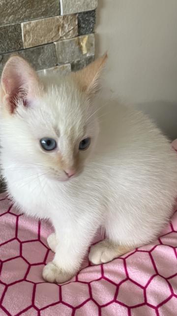 Biscuit - Adopted Female2 MonthsBiscuit is 11 weeks old and has the colours and blue eyes of a Flame Point kitty. She purrs like a motorboat!!! This little girl has the look of elegance. Biscuit has tiny paws and a big heart.